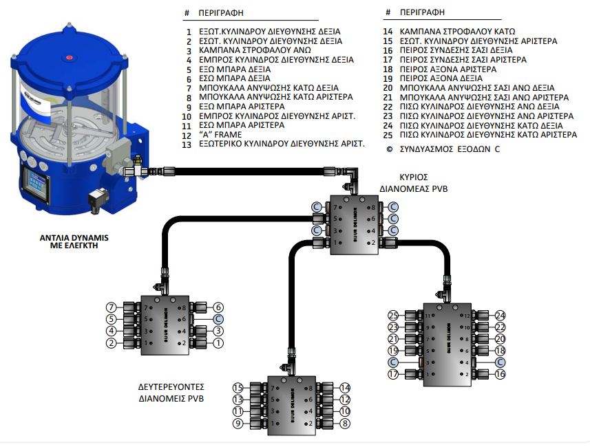 • Βελτιώνει την ασφάλεια εξαλείφοντας την ανάγκη χειρωνακτικής λίπανσης, αφού ο χειριστής δε χρειάζεται να σέρνεται κάτω από το μηχάνημα ή να παιδευτεί για να λιπάνει δυσπρόσιτα σημεία.